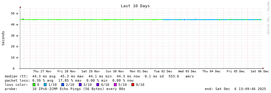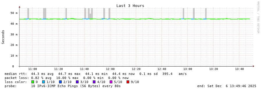 11 > 2001:4350:0:1010::3 (2001:4350:0:1010::3) [AS5438] 44.372ms 44.428ms 44.350ms